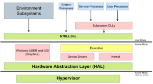 - Environment Subsystems – This is essentially what users and programmers are presented. Think of it as the underlying implementation of the overall environment/personality presented to the OS users and programmers. There are three main subsystems which are Windows, POSIX, and OS/2. OS/2 was last used in Windows 2000. POSIX was replaced by the Subsystem for Unix-based Applications (SUA) which was then replaced with Windows Subsystem for Linux (WSL).