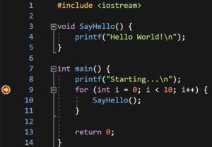 - Breakpoint – Pauses execution at the line of code the breakpoint is set on. When execution reaches a breakpoint that is known as “hitting a breakpoint”. When a breakpoint is hit execution stops before the line of code the breakpoint is on is executed. In the following example, line 9 is not executed when the breakpoint is hit. Line 9 is executed when execution continues past the breakpoint.