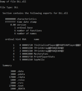 Let’s take a look at the DLL’s exports. I will show you two tools we can use to do this. The first tool is DUMPBIN. This comes with Visual Studio. DUMPBIN is available in the developer command prompt. Open the dev prompt then navigate to the directory of the DLL. To show the exports for a DLL use the command dumpbin DLL.dll /EXPORTS.