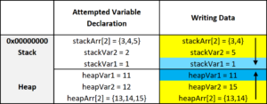 - After allocating the space for the variables, data is put into those variables. It’s all pretty simple but something interesting is going on with the array. Notice how it only allocated an array of 2 elements, but it was given 3. Because data is written from lower address to higher or left to right and top to bottom, it overwrites the data of the variable below it. So instead of