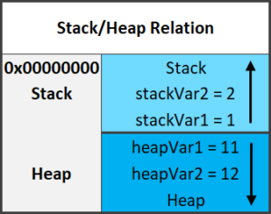 In the diagram above, stackVar1 was created before stackVar2, likewise for the heap variables.