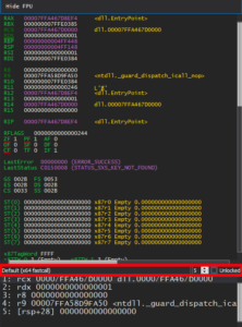 x64dbg does actually tell you that it’s fastcall. x64dbg allows you to view the parameters passed to a function and it allows you to view the parameters with different calling conventions. Typically you can choose what calling convention is being used, however, x64dbg is only allowing us to use fastcall which is another strong indicator (although not a guarantee) that we are dealing with fastcall. You can see the parameters and calling convention under the registers window.