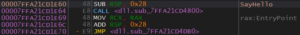 The start of the functions look almost exactly the same. At this point, we can be pretty confident that the function SayHello() is calling is std::cout. Let’s take a look at the jump instruction at the end of the SayHello() function and see what we can find there. Here is the code that is jumped to: